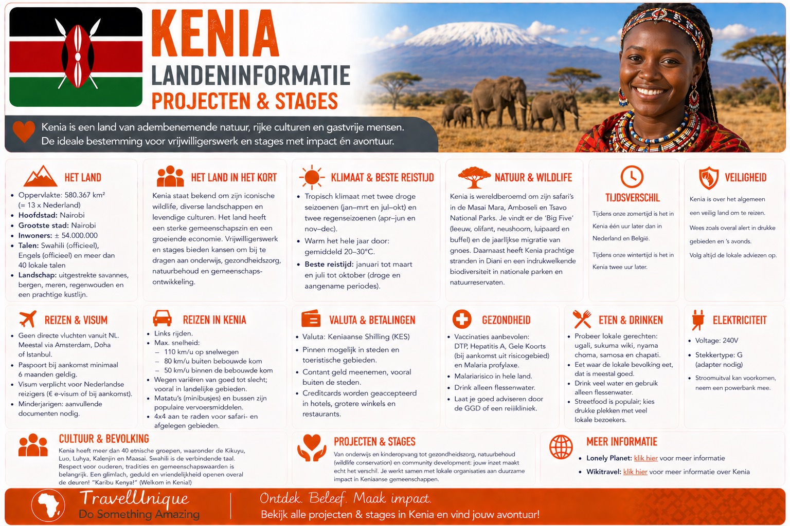 Wil je deelnemen aan één van bovenstaande projecten in Kenia lees dan heel goed de projectomschrijving door. Bepaal aan welk project je wilt deelnemen en lees vervolgens de landeninformatie over Kenia.
