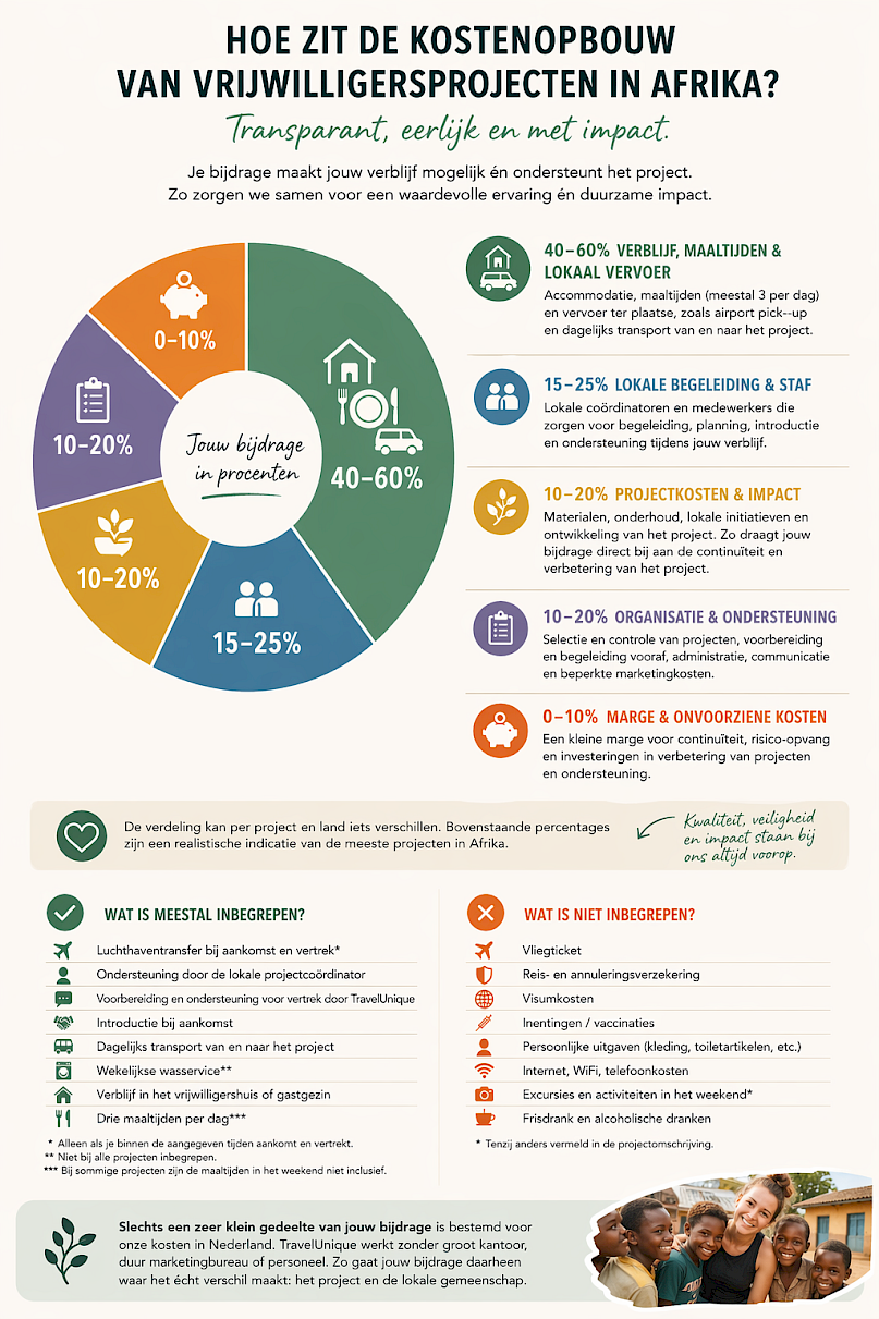Vrijwilligerswerk in Afrika is geen “gratis reis” — en dat is juist een goed teken. Je betaalt niet om te mogen helpen. Je betaalt voor alles wat nodig is om jouw verblijf veilig, goed georganiseerd en waardevol te maken — voor jou én voor het project.